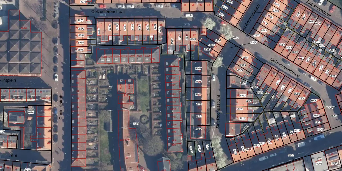 Het perceel waarop Coninckstraat 67-15 staat heeft een oppervlakte van 5892 m². Dit is een zeer groot perceel. De perceeloppervlakte wordt geregistreerd door het Kadaster. Gedetailleerde informatie over de maten van dit perceel kunt u vinden in het rapport Kadastrale kaart met maatvoering van Coninckstraat 67-15.