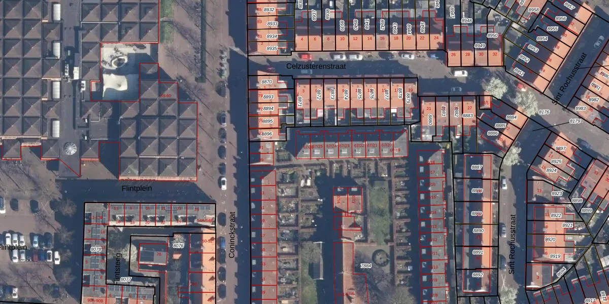 Het perceel waarop Coninckstraat 67-26 staat heeft een oppervlakte van 5892 m². Dit is een zeer groot perceel. De perceeloppervlakte wordt geregistreerd door het Kadaster. Gedetailleerde informatie over de maten van dit perceel kunt u vinden in het rapport Kadastrale kaart met maatvoering van Coninckstraat 67-26.