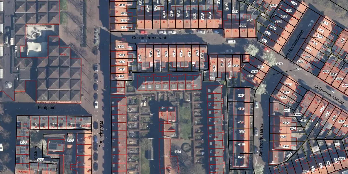 Het perceel waarop Coninckstraat 67-22 staat heeft een oppervlakte van 5892 m². Dit is een zeer groot perceel. De perceeloppervlakte wordt geregistreerd door het Kadaster. Gedetailleerde informatie over de maten van dit perceel kunt u vinden in het rapport Kadastrale kaart met maatvoering van Coninckstraat 67-22.