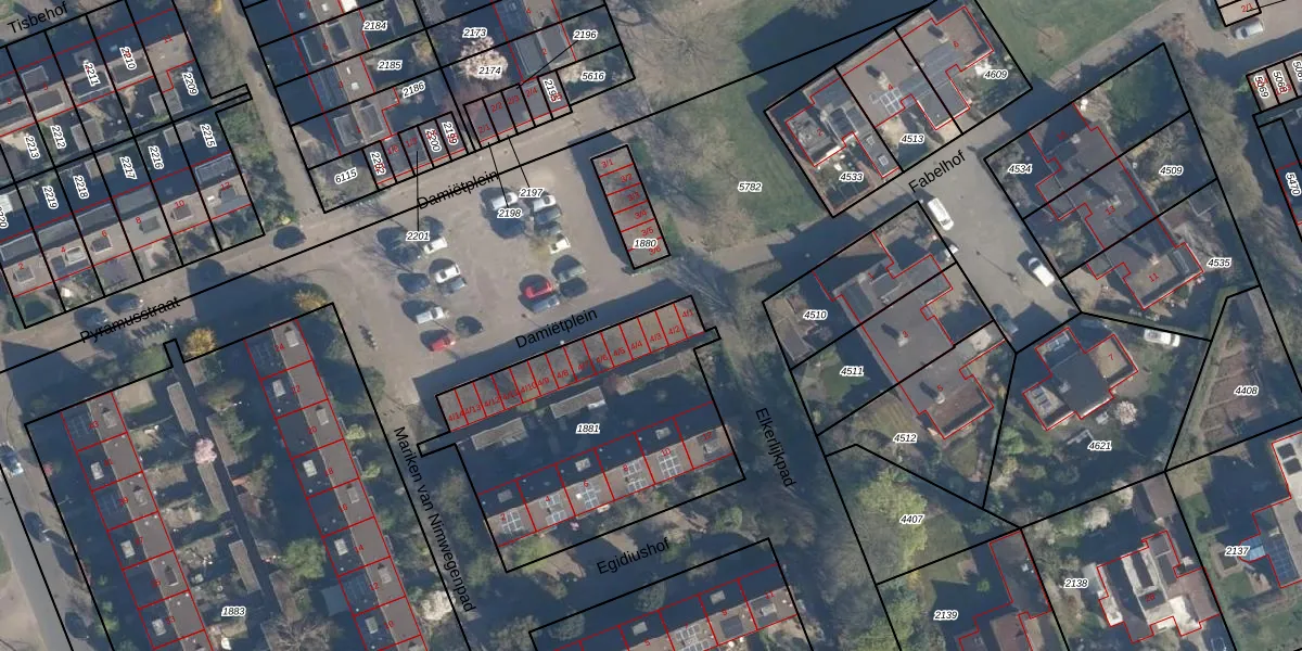 Het perceel waarop Damiëtplein 4-3 staat heeft een oppervlakte van 1194 m². Dit is een zeer groot perceel. De perceeloppervlakte wordt geregistreerd door het Kadaster. Gedetailleerde informatie over de maten van dit perceel kunt u vinden in het rapport Kadastrale kaart met maatvoering van Damiëtplein 4-3.
