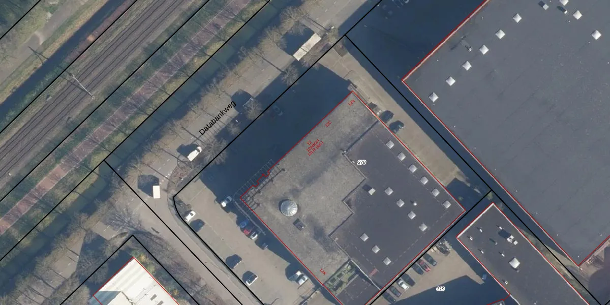 Het perceel waarop Databankweg 12-A staat heeft een oppervlakte van 5607 m². Dit is een zeer groot perceel. De perceeloppervlakte wordt geregistreerd door het Kadaster. Gedetailleerde informatie over de maten van dit perceel kunt u vinden in het rapport Kadastrale kaart met maatvoering van Databankweg 12-A.