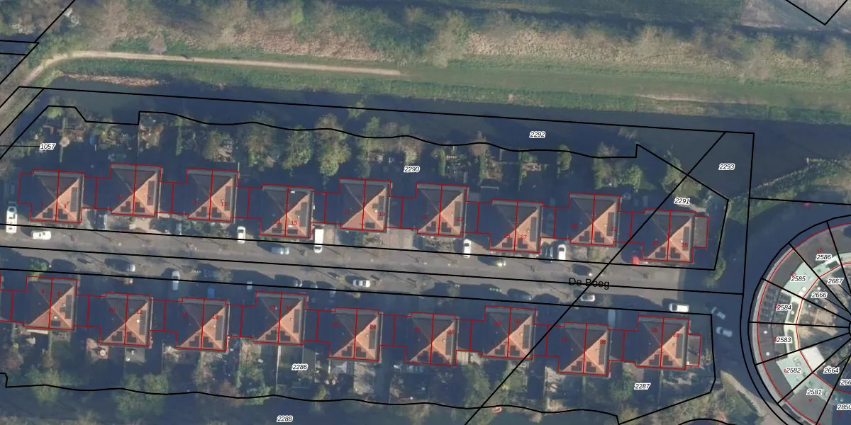 De Boeg 21 is gelegen op kadastraal perceel AMF00O2290. Deze kadastrale aanduiding is uniek en wordt gebruikt door het Kadaster om eigendomsrechten en andere zakelijke rechten vast te leggen. Het perceel maakt onderdeel uit van de kadastrale gemeente Amersfoort.