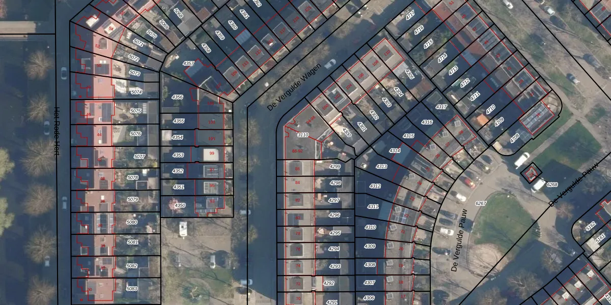 Het perceel waarop De Vergulde Wagen 90 staat heeft een oppervlakte van 340 m². Dit is een groot perceel. De perceeloppervlakte wordt geregistreerd door het Kadaster. Gedetailleerde informatie over de maten van dit perceel kunt u vinden in het rapport Kadastrale kaart met maatvoering van De Vergulde Wagen 90.