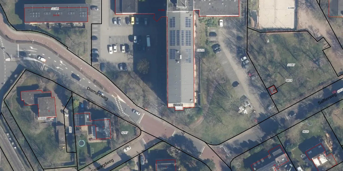 Het perceel waarop Diamantweg 10-J staat heeft een oppervlakte van 8370 m². Dit is een zeer groot perceel. De perceeloppervlakte wordt geregistreerd door het Kadaster. Gedetailleerde informatie over de maten van dit perceel kunt u vinden in het rapport Kadastrale kaart met maatvoering van Diamantweg 10-J.