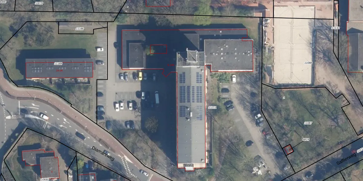 Het perceel waarop Diamantweg 10-M staat heeft een oppervlakte van 8370 m². Dit is een zeer groot perceel. De perceeloppervlakte wordt geregistreerd door het Kadaster. Gedetailleerde informatie over de maten van dit perceel kunt u vinden in het rapport Kadastrale kaart met maatvoering van Diamantweg 10-M.