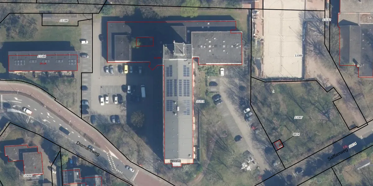Het perceel waarop Diamantweg 14-C staat heeft een oppervlakte van 8370 m². Dit is een zeer groot perceel. De perceeloppervlakte wordt geregistreerd door het Kadaster. Gedetailleerde informatie over de maten van dit perceel kunt u vinden in het rapport Kadastrale kaart met maatvoering van Diamantweg 14-C.