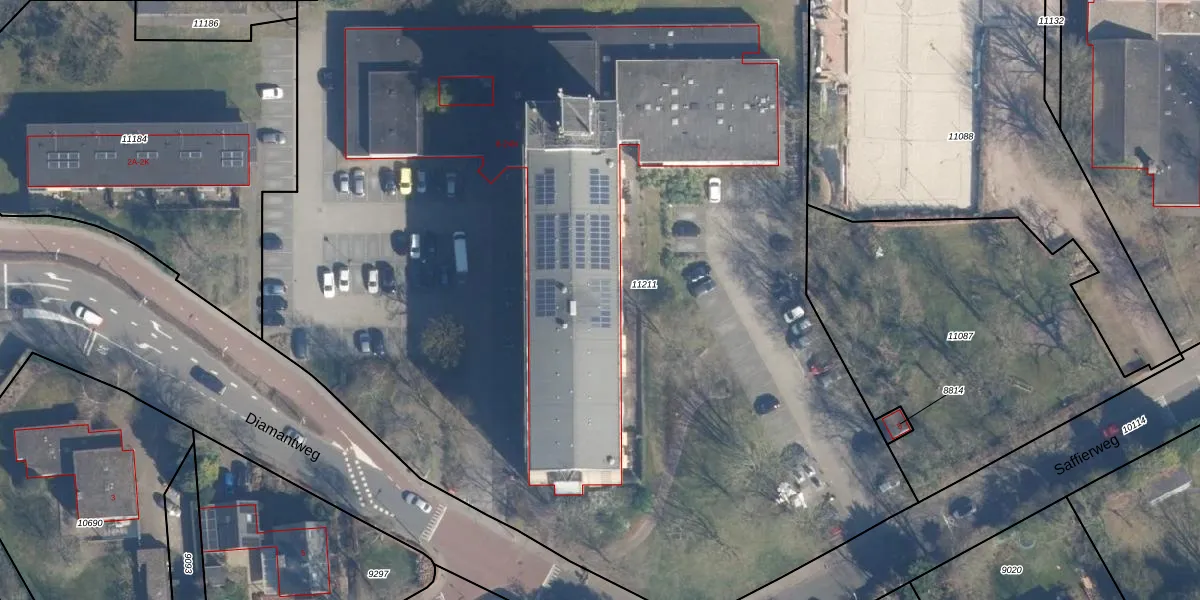 Het perceel waarop Diamantweg 14-D staat heeft een oppervlakte van 8370 m². Dit is een zeer groot perceel. De perceeloppervlakte wordt geregistreerd door het Kadaster. Gedetailleerde informatie over de maten van dit perceel kunt u vinden in het rapport Kadastrale kaart met maatvoering van Diamantweg 14-D.