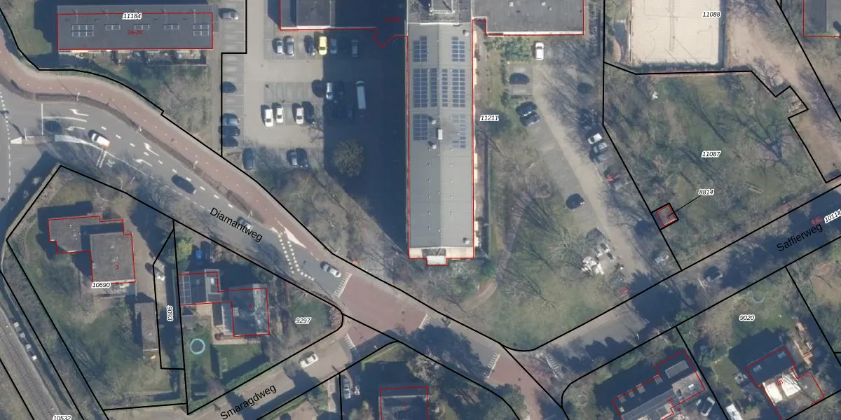 Het perceel waarop Diamantweg 14-L staat heeft een oppervlakte van 8370 m². Dit is een zeer groot perceel. De perceeloppervlakte wordt geregistreerd door het Kadaster. Gedetailleerde informatie over de maten van dit perceel kunt u vinden in het rapport Kadastrale kaart met maatvoering van Diamantweg 14-L.
