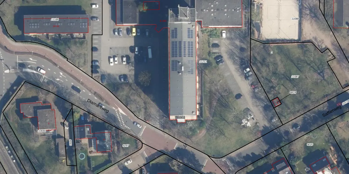 Het perceel waarop Diamantweg 14-M staat heeft een oppervlakte van 8370 m². Dit is een zeer groot perceel. De perceeloppervlakte wordt geregistreerd door het Kadaster. Gedetailleerde informatie over de maten van dit perceel kunt u vinden in het rapport Kadastrale kaart met maatvoering van Diamantweg 14-M.