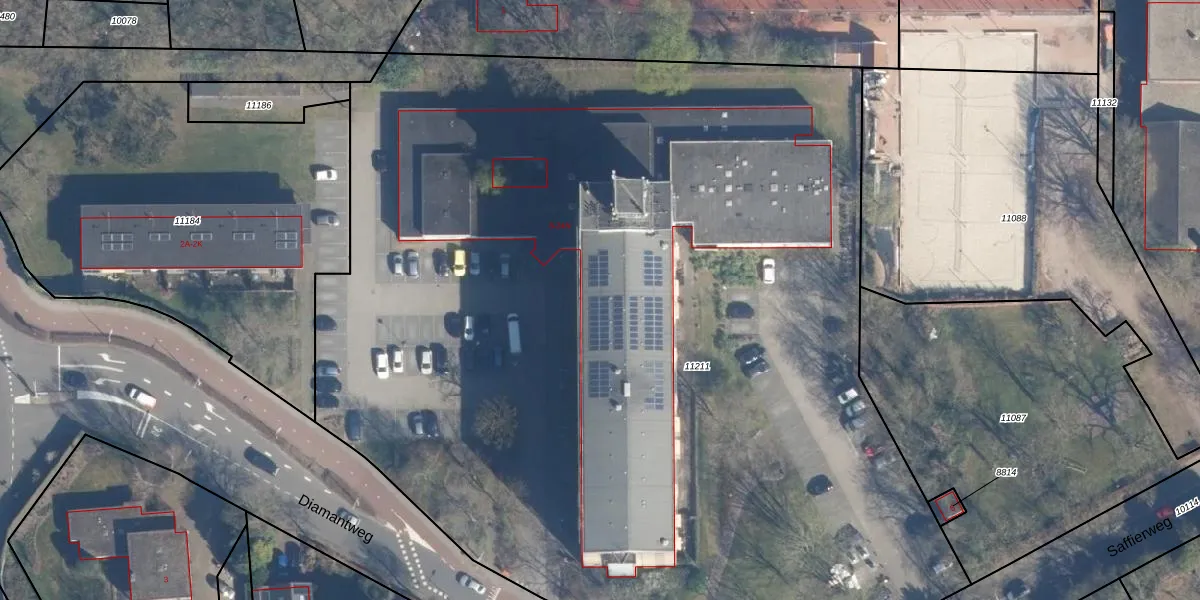 Het perceel waarop Diamantweg 14-S staat heeft een oppervlakte van 8370 m². Dit is een zeer groot perceel. De perceeloppervlakte wordt geregistreerd door het Kadaster. Gedetailleerde informatie over de maten van dit perceel kunt u vinden in het rapport Kadastrale kaart met maatvoering van Diamantweg 14-S.
