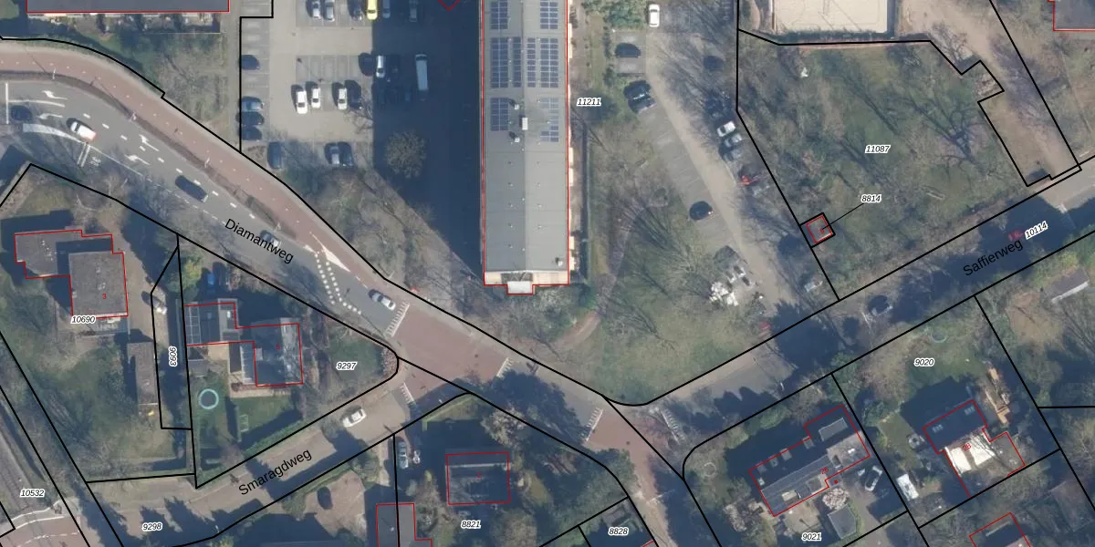 Het perceel waarop Diamantweg 16-G staat heeft een oppervlakte van 8370 m². Dit is een zeer groot perceel. De perceeloppervlakte wordt geregistreerd door het Kadaster. Gedetailleerde informatie over de maten van dit perceel kunt u vinden in het rapport Kadastrale kaart met maatvoering van Diamantweg 16-G.