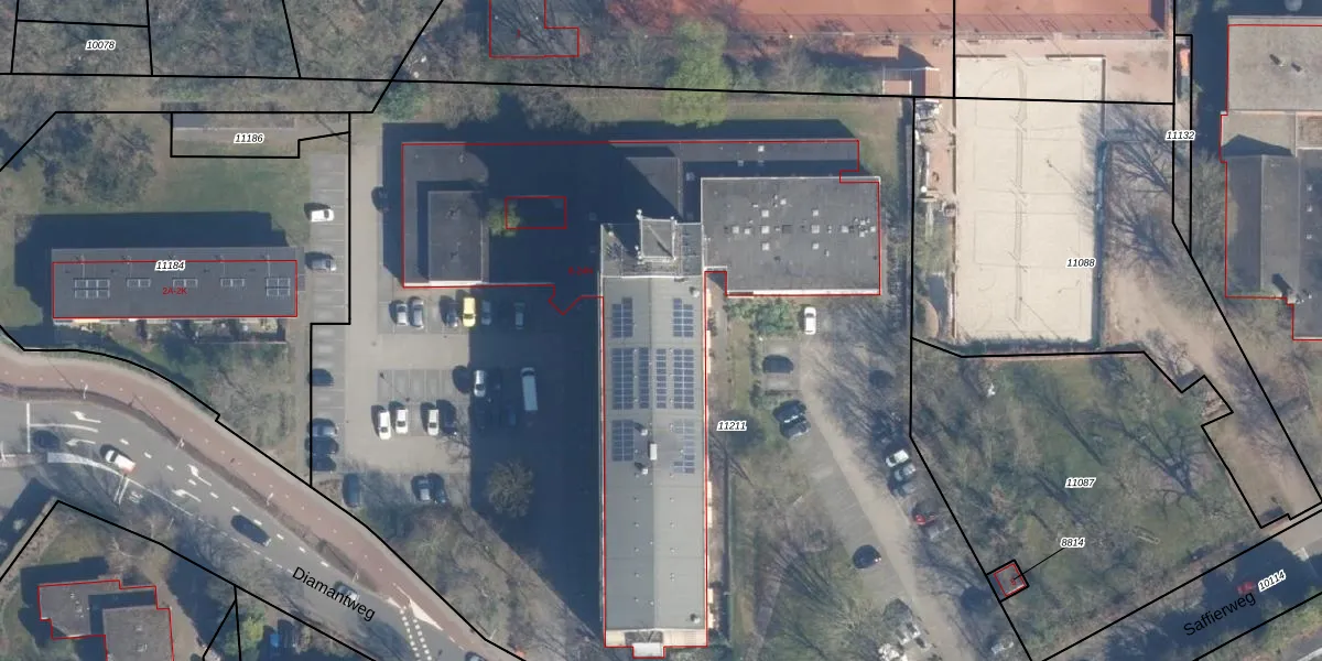 Het perceel waarop Diamantweg 22-A staat heeft een oppervlakte van 8370 m². Dit is een zeer groot perceel. De perceeloppervlakte wordt geregistreerd door het Kadaster. Gedetailleerde informatie over de maten van dit perceel kunt u vinden in het rapport Kadastrale kaart met maatvoering van Diamantweg 22-A.