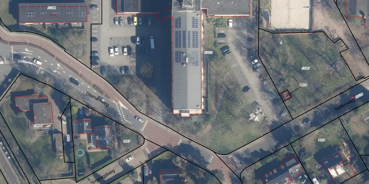 Het perceel waarop Diamantweg 22-J staat heeft een oppervlakte van 8370 m². Dit is een zeer groot perceel. De perceeloppervlakte wordt geregistreerd door het Kadaster. Gedetailleerde informatie over de maten van dit perceel kunt u vinden in het rapport Kadastrale kaart met maatvoering van Diamantweg 22-J.