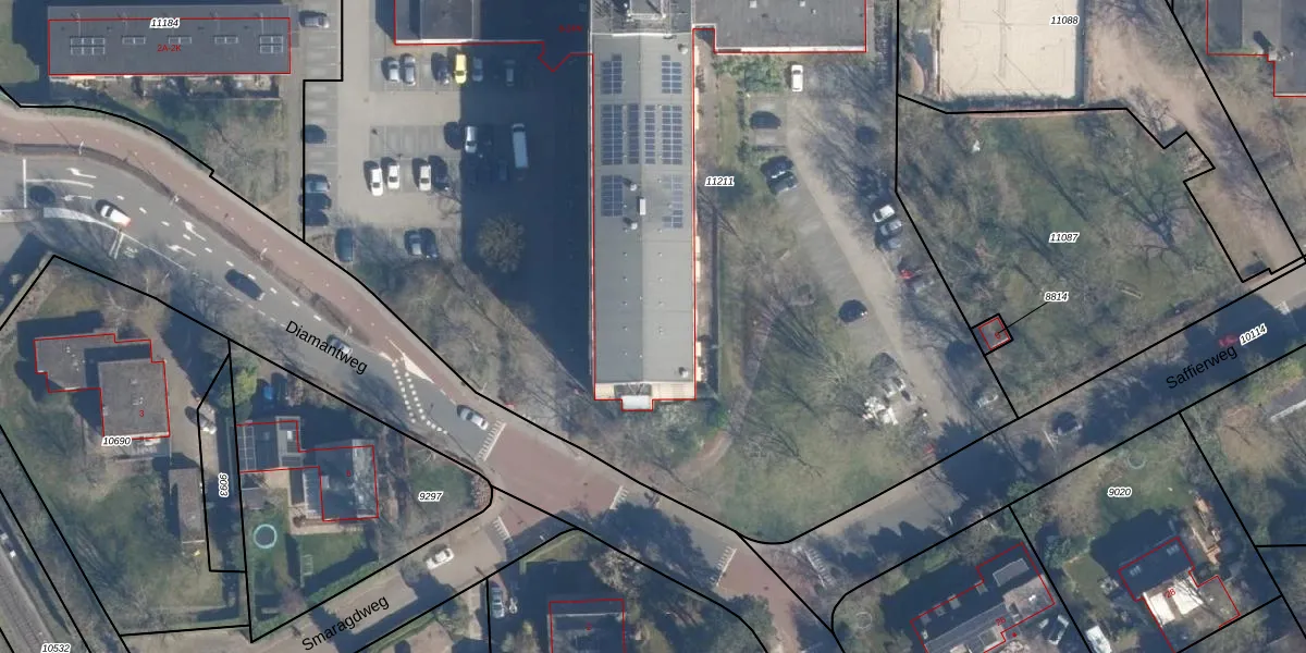 Het perceel waarop Diamantweg 24-F staat heeft een oppervlakte van 8370 m². Dit is een zeer groot perceel. De perceeloppervlakte wordt geregistreerd door het Kadaster. Gedetailleerde informatie over de maten van dit perceel kunt u vinden in het rapport Kadastrale kaart met maatvoering van Diamantweg 24-F.