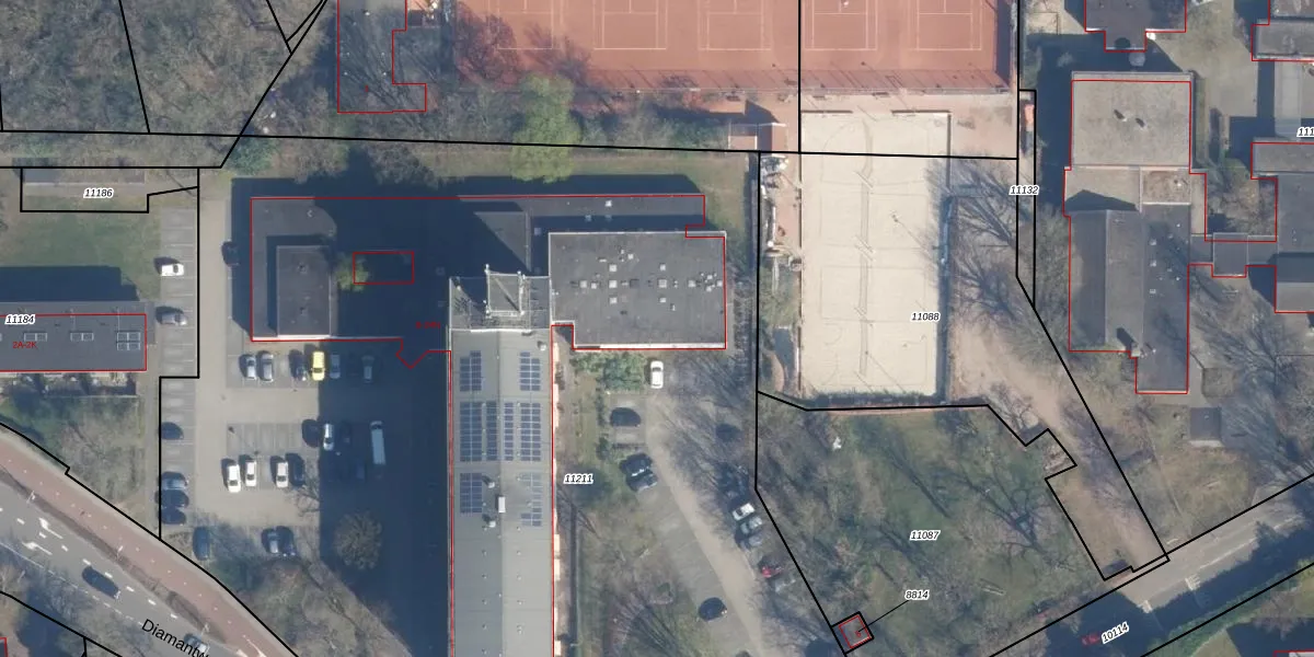 Het perceel waarop Diamantweg 8-J staat heeft een oppervlakte van 8370 m². Dit is een zeer groot perceel. De perceeloppervlakte wordt geregistreerd door het Kadaster. Gedetailleerde informatie over de maten van dit perceel kunt u vinden in het rapport Kadastrale kaart met maatvoering van Diamantweg 8-J.
