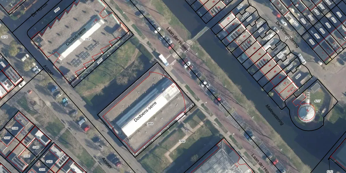 Het perceel waarop Dodoens-serre 19 staat heeft een oppervlakte van 1530 m². Dit is een zeer groot perceel. De perceeloppervlakte wordt geregistreerd door het Kadaster. Gedetailleerde informatie over de maten van dit perceel kunt u vinden in het rapport Kadastrale kaart met maatvoering van Dodoens-serre 19.