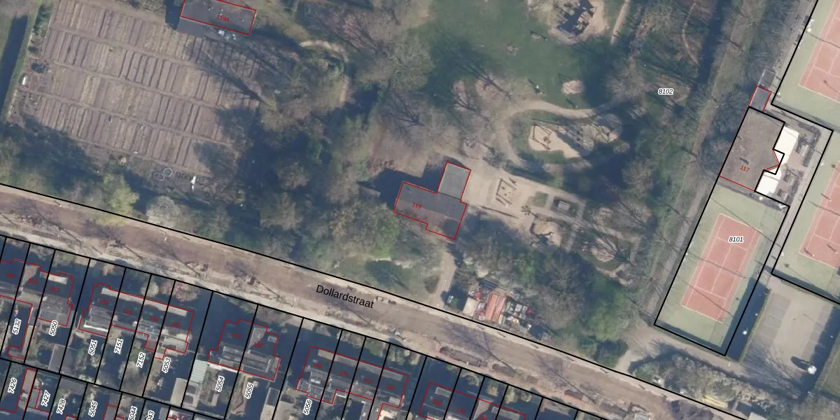 Het perceel waarop Dollardstraat 119 staat heeft een oppervlakte van 4,4 ha. Dit is een zeer groot perceel. De perceeloppervlakte wordt geregistreerd door het Kadaster. Gedetailleerde informatie over de maten van dit perceel kunt u vinden in het rapport Kadastrale kaart met maatvoering van Dollardstraat 119.