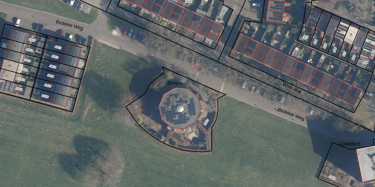 Het perceel waarop Donjon 4 staat heeft een oppervlakte van 1465 m². Dit is een zeer groot perceel. De perceeloppervlakte wordt geregistreerd door het Kadaster. Gedetailleerde informatie over de maten van dit perceel kunt u vinden in het rapport Kadastrale kaart met maatvoering van Donjon 4.