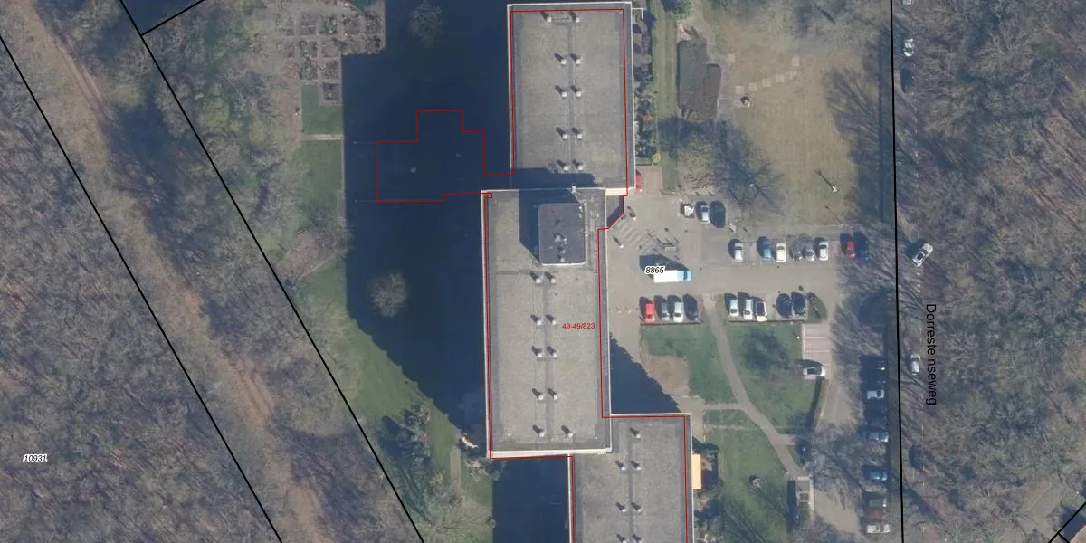 Het perceel waarop Dorresteinseweg 49-608 staat heeft een oppervlakte van 1,8 ha. Dit is een zeer groot perceel. De perceeloppervlakte wordt geregistreerd door het Kadaster. Gedetailleerde informatie over de maten van dit perceel kunt u vinden in het rapport Kadastrale kaart met maatvoering van Dorresteinseweg 49-608.