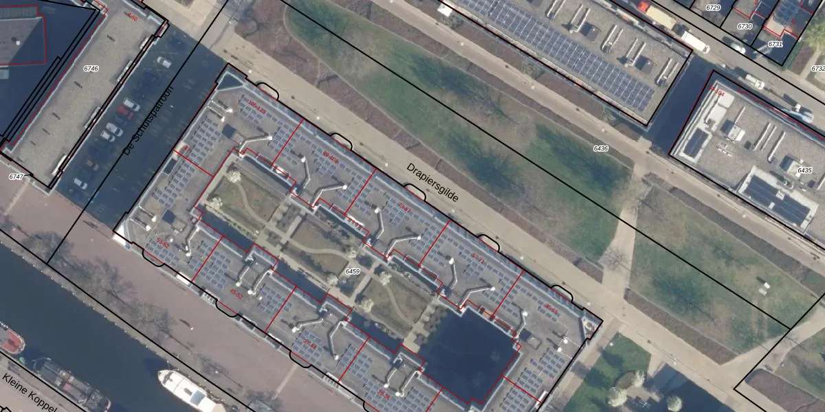 Het perceel waarop Drapiersgilde 77 staat heeft een oppervlakte van 5383 m². Dit is een zeer groot perceel. De perceeloppervlakte wordt geregistreerd door het Kadaster. Gedetailleerde informatie over de maten van dit perceel kunt u vinden in het rapport Kadastrale kaart met maatvoering van Drapiersgilde 77.