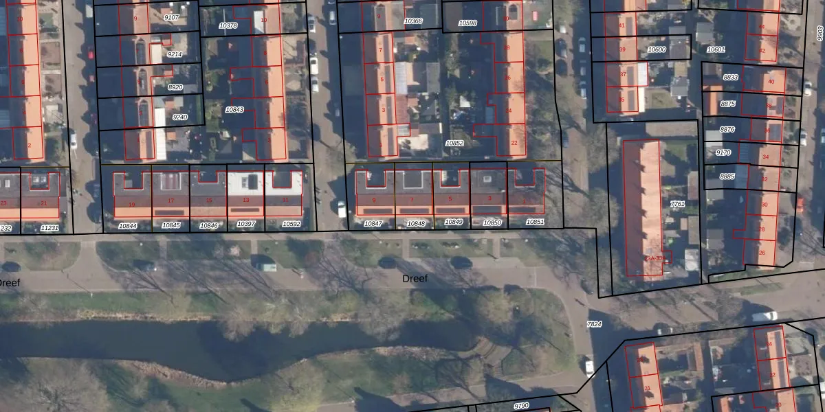 Dreef 7 is gelegen op kadastraal perceel AMF00D10848. Deze kadastrale aanduiding is uniek en wordt gebruikt door het Kadaster om eigendomsrechten en andere zakelijke rechten vast te leggen. Het perceel maakt onderdeel uit van de kadastrale gemeente Amersfoort.