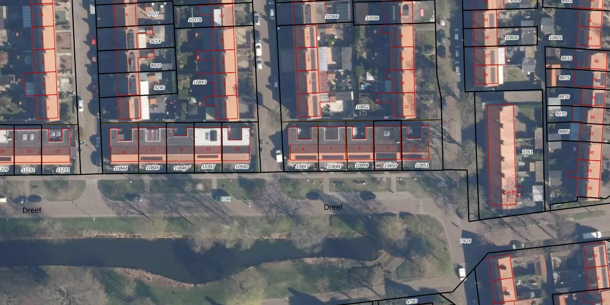 Het perceel waarop Dreef 9 staat heeft een oppervlakte van 195 m². Dit is een middelgroot perceel. De perceeloppervlakte wordt geregistreerd door het Kadaster. Gedetailleerde informatie over de maten van dit perceel kunt u vinden in het rapport Kadastrale kaart met maatvoering van Dreef 9.