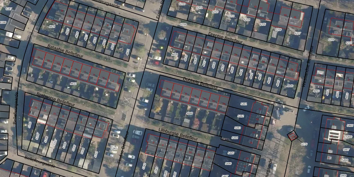 Het perceel waarop Dubbele Bellefleur 4 staat heeft een oppervlakte van 1030 m². Dit is een zeer groot perceel. De perceeloppervlakte wordt geregistreerd door het Kadaster. Gedetailleerde informatie over de maten van dit perceel kunt u vinden in het rapport Kadastrale kaart met maatvoering van Dubbele Bellefleur 4.