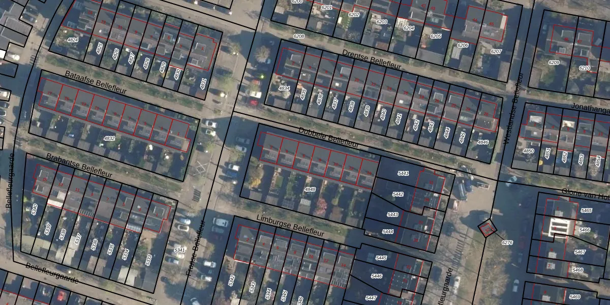 Het perceel waarop Dubbele Bellefleur 6 staat heeft een oppervlakte van 1030 m². Dit is een zeer groot perceel. De perceeloppervlakte wordt geregistreerd door het Kadaster. Gedetailleerde informatie over de maten van dit perceel kunt u vinden in het rapport Kadastrale kaart met maatvoering van Dubbele Bellefleur 6.