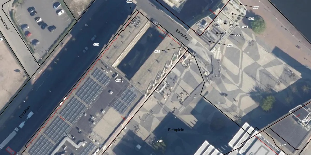 Het perceel waarop Eemplein 44 staat heeft een oppervlakte van 5835 m². Dit is een zeer groot perceel. De perceeloppervlakte wordt geregistreerd door het Kadaster. Gedetailleerde informatie over de maten van dit perceel kunt u vinden in het rapport Kadastrale kaart met maatvoering van Eemplein 44.