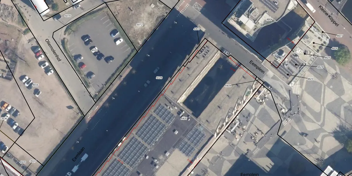 Het perceel waarop Eemplein 50 staat heeft een oppervlakte van 5835 m². Dit is een zeer groot perceel. De perceeloppervlakte wordt geregistreerd door het Kadaster. Gedetailleerde informatie over de maten van dit perceel kunt u vinden in het rapport Kadastrale kaart met maatvoering van Eemplein 50.