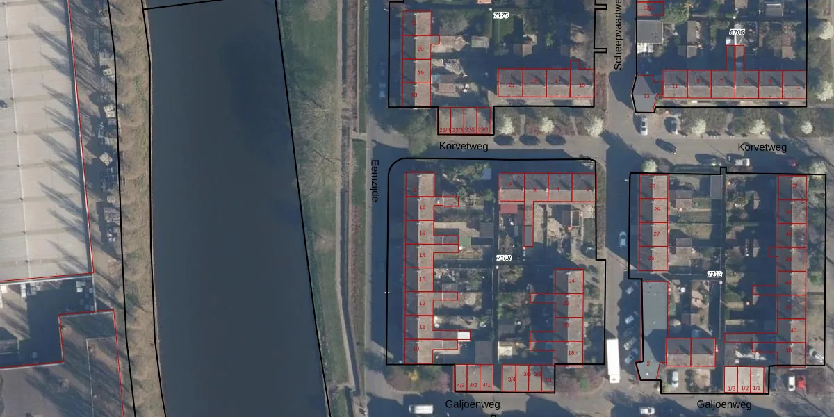 Het perceel waarop Eemzijde 16 staat heeft een oppervlakte van 2678 m². Dit is een zeer groot perceel. De perceeloppervlakte wordt geregistreerd door het Kadaster. Gedetailleerde informatie over de maten van dit perceel kunt u vinden in het rapport Kadastrale kaart met maatvoering van Eemzijde 16.