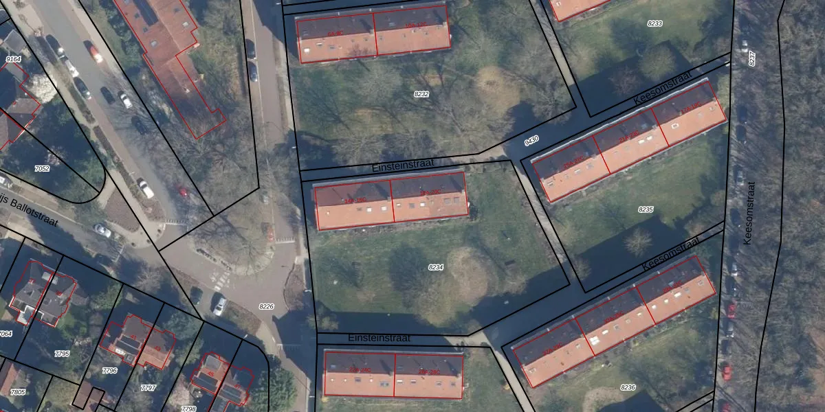 Het perceel waarop Einsteinstraat 20-C staat heeft een oppervlakte van 2200 m². Dit is een zeer groot perceel. De perceeloppervlakte wordt geregistreerd door het Kadaster. Gedetailleerde informatie over de maten van dit perceel kunt u vinden in het rapport Kadastrale kaart met maatvoering van Einsteinstraat 20-C.