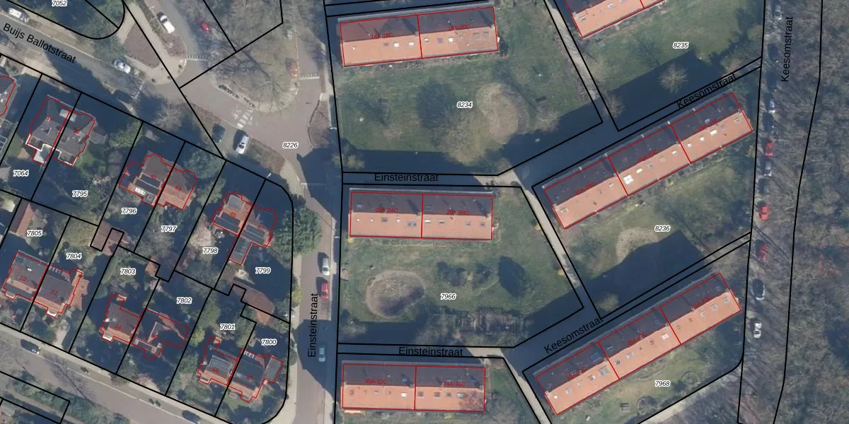 Het perceel waarop Einsteinstraat 26-B staat heeft een oppervlakte van 1895 m². Dit is een zeer groot perceel. De perceeloppervlakte wordt geregistreerd door het Kadaster. Gedetailleerde informatie over de maten van dit perceel kunt u vinden in het rapport Kadastrale kaart met maatvoering van Einsteinstraat 26-B.
