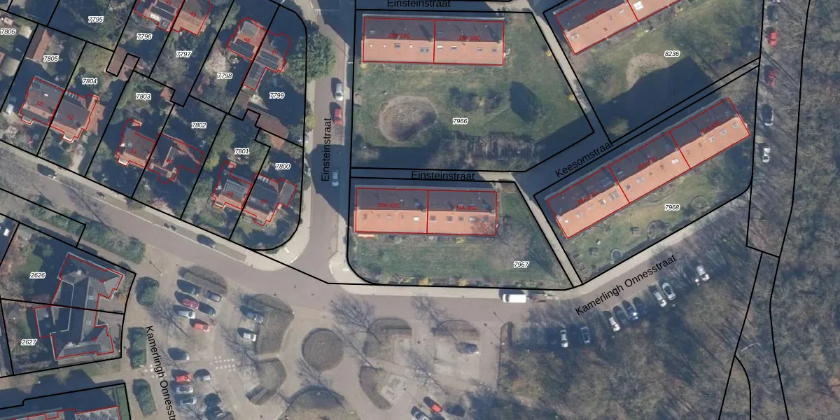 Het perceel waarop Einsteinstraat 32-B staat heeft een oppervlakte van 1185 m². Dit is een zeer groot perceel. De perceeloppervlakte wordt geregistreerd door het Kadaster. Gedetailleerde informatie over de maten van dit perceel kunt u vinden in het rapport Kadastrale kaart met maatvoering van Einsteinstraat 32-B.