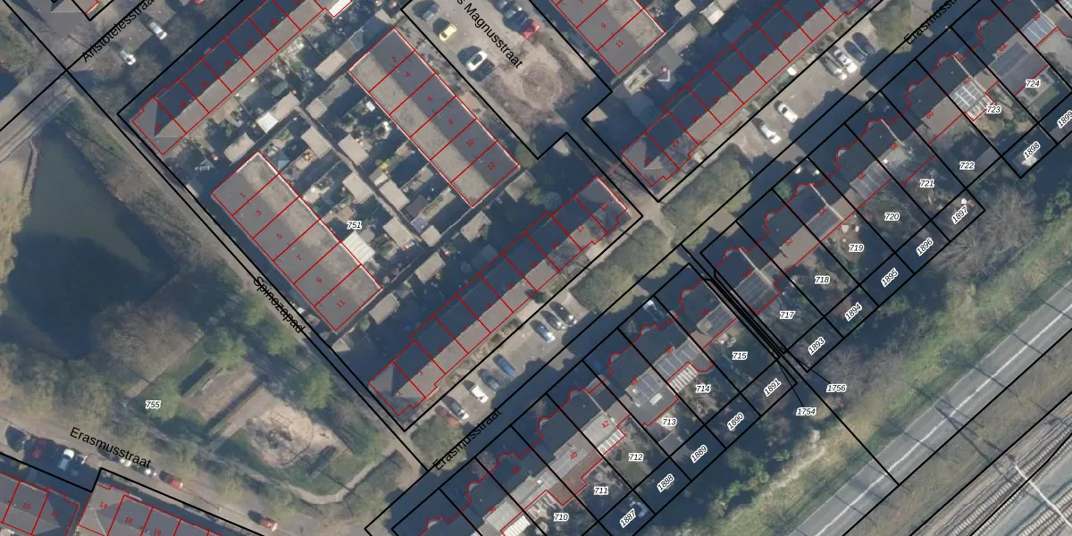 Het perceel waarop Erasmusstraat 13 staat heeft een oppervlakte van 4495 m². Dit is een zeer groot perceel. De perceeloppervlakte wordt geregistreerd door het Kadaster. Gedetailleerde informatie over de maten van dit perceel kunt u vinden in het rapport Kadastrale kaart met maatvoering van Erasmusstraat 13.
