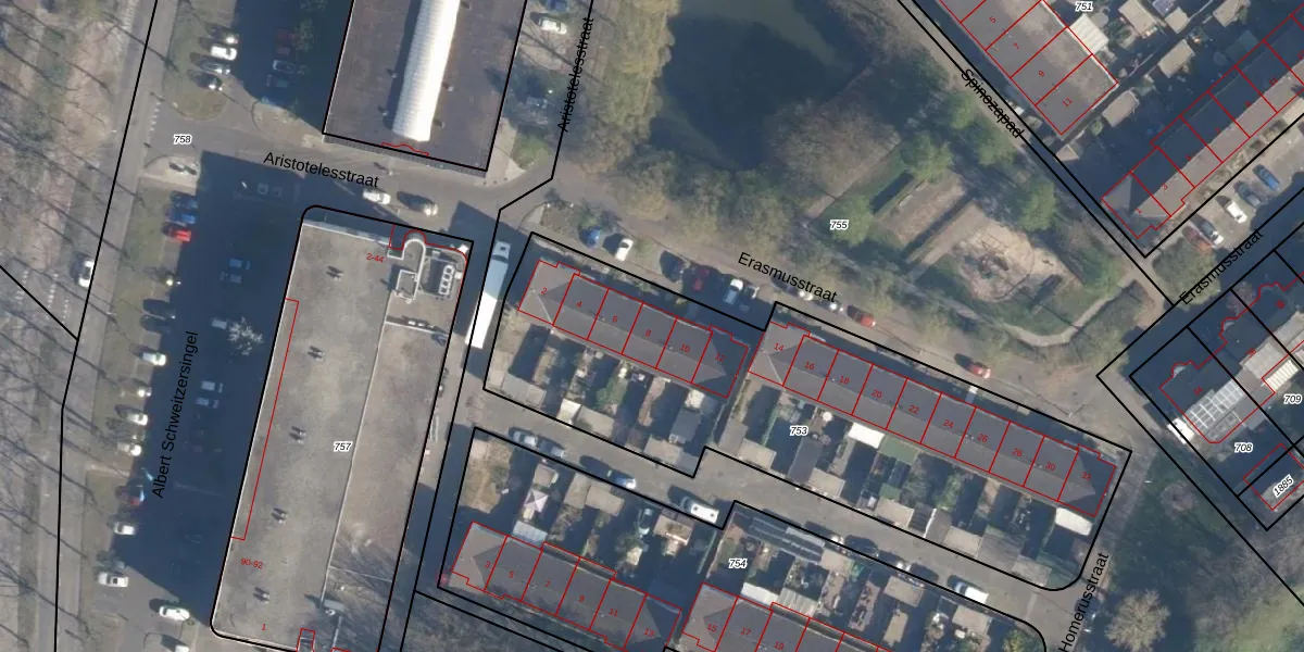 Het perceel waarop Erasmusstraat 8 staat heeft een oppervlakte van 2385 m². Dit is een zeer groot perceel. De perceeloppervlakte wordt geregistreerd door het Kadaster. Gedetailleerde informatie over de maten van dit perceel kunt u vinden in het rapport Kadastrale kaart met maatvoering van Erasmusstraat 8.
