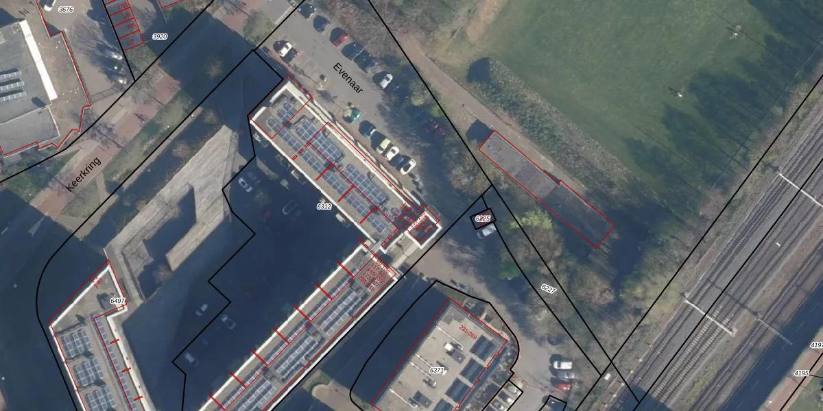 Het perceel waarop Evenaar 89-1 staat heeft een oppervlakte van 4294 m². Dit is een zeer groot perceel. De perceeloppervlakte wordt geregistreerd door het Kadaster. Gedetailleerde informatie over de maten van dit perceel kunt u vinden in het rapport Kadastrale kaart met maatvoering van Evenaar 89-1.