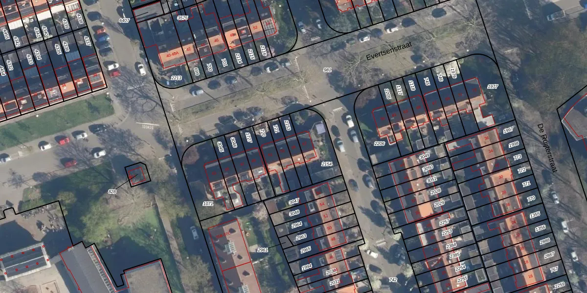 Het perceel waarop Evertsenstraat 55 staat heeft een oppervlakte van 108 m². Dit is een middelgroot perceel. De perceeloppervlakte wordt geregistreerd door het Kadaster. Gedetailleerde informatie over de maten van dit perceel kunt u vinden in het rapport Kadastrale kaart met maatvoering van Evertsenstraat 55.