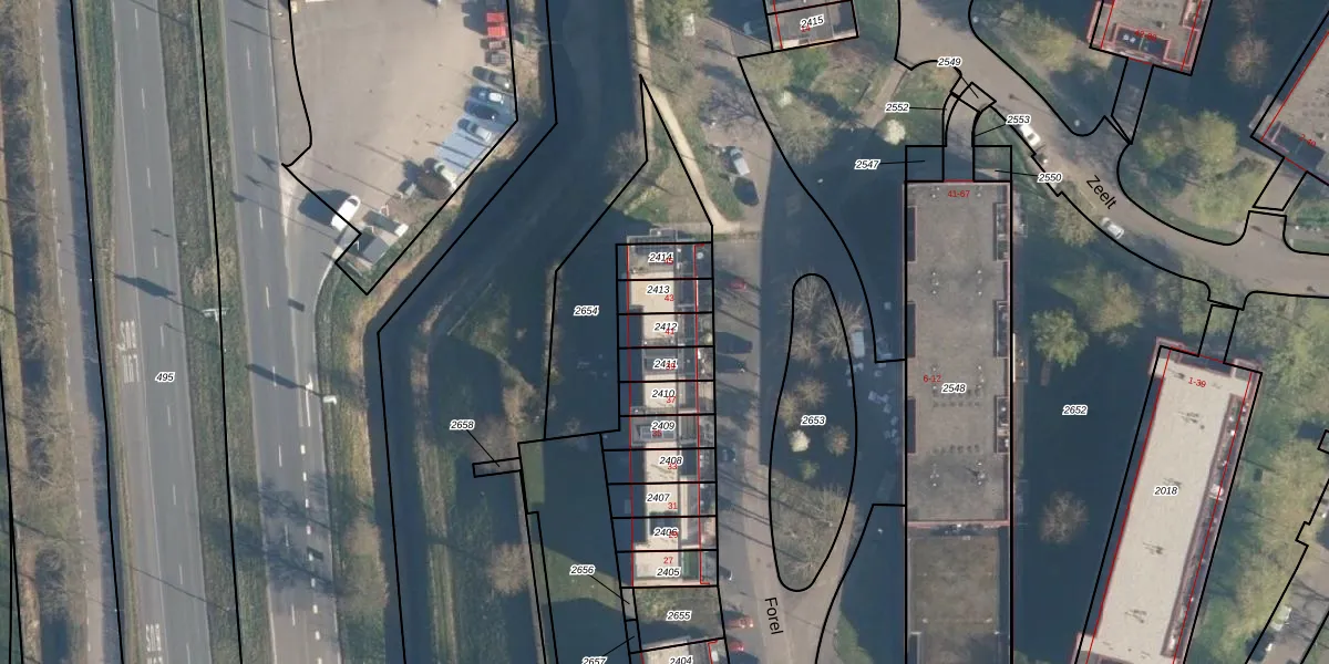 Forel 41 is gelegen op kadastraal perceel AMF00P2412. Deze kadastrale aanduiding is uniek en wordt gebruikt door het Kadaster om eigendomsrechten en andere zakelijke rechten vast te leggen. Het perceel maakt onderdeel uit van de kadastrale gemeente Amersfoort.