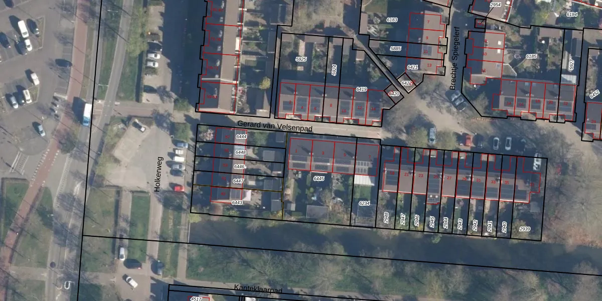 Gerard van Velsenpad 1 is gelegen op kadastraal perceel AMF00K6445. Deze kadastrale aanduiding is uniek en wordt gebruikt door het Kadaster om eigendomsrechten en andere zakelijke rechten vast te leggen. Het perceel maakt onderdeel uit van de kadastrale gemeente Amersfoort.