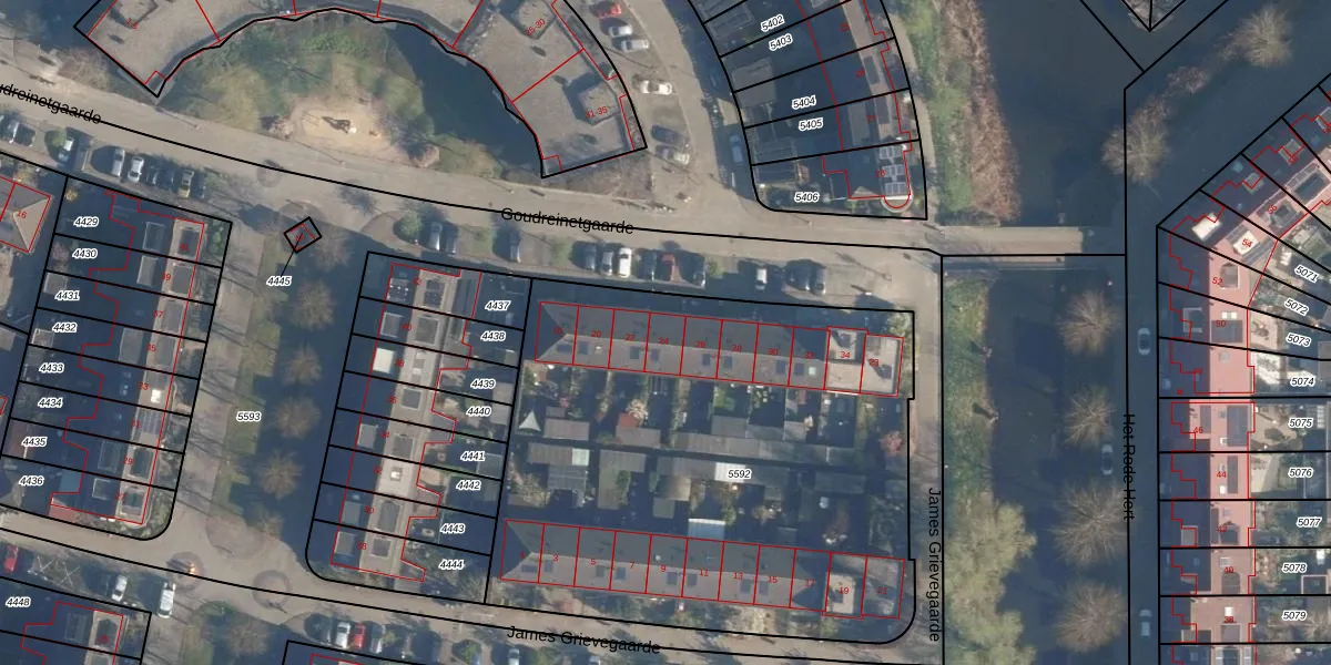 Het perceel waarop Goudreinetgaarde 24 staat heeft een oppervlakte van 3025 m². Dit is een zeer groot perceel. De perceeloppervlakte wordt geregistreerd door het Kadaster. Gedetailleerde informatie over de maten van dit perceel kunt u vinden in het rapport Kadastrale kaart met maatvoering van Goudreinetgaarde 24.