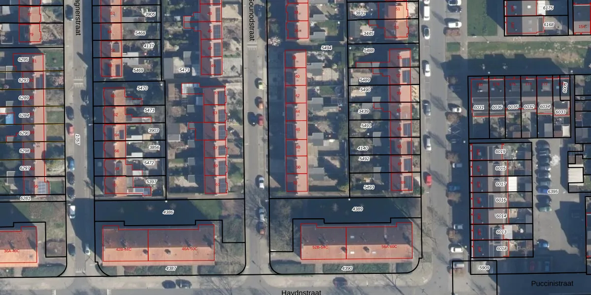 Het perceel waarop Gounodstraat 48 staat heeft een oppervlakte van 2551 m². Dit is een zeer groot perceel. De perceeloppervlakte wordt geregistreerd door het Kadaster. Gedetailleerde informatie over de maten van dit perceel kunt u vinden in het rapport Kadastrale kaart met maatvoering van Gounodstraat 48.