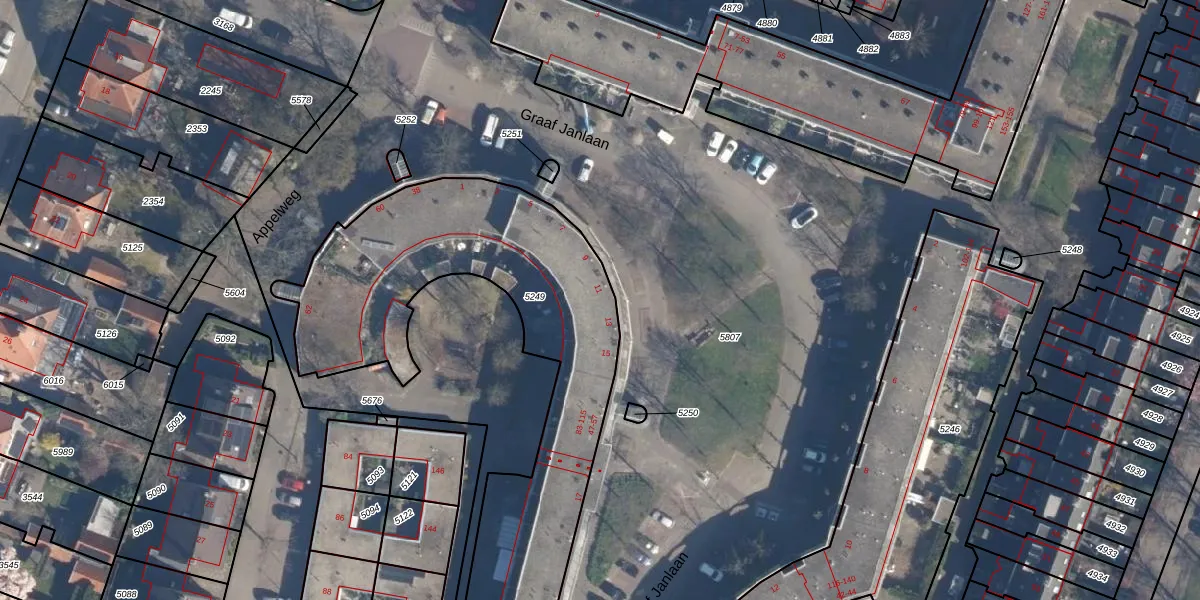 Het perceel waarop Graaf Janlaan 7 staat heeft een oppervlakte van 1955 m². Dit is een zeer groot perceel. De perceeloppervlakte wordt geregistreerd door het Kadaster. Gedetailleerde informatie over de maten van dit perceel kunt u vinden in het rapport Kadastrale kaart met maatvoering van Graaf Janlaan 7.