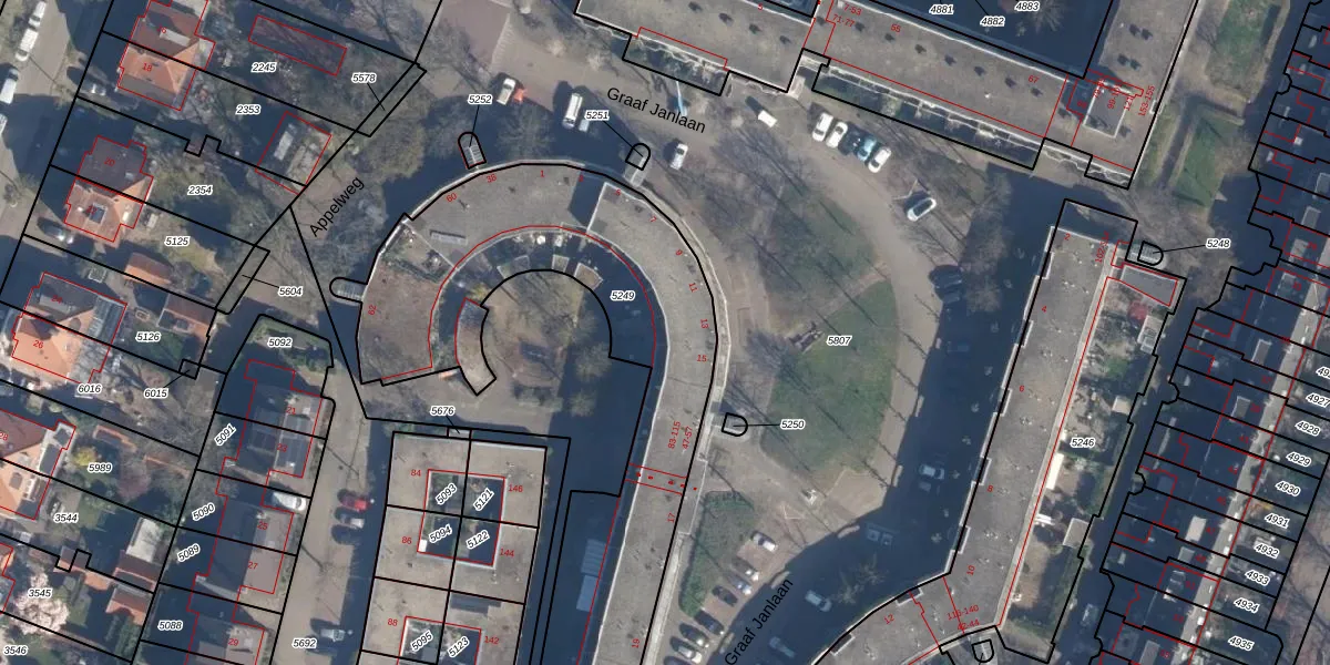 Het perceel waarop Graaf Janlaan 89 staat heeft een oppervlakte van 1955 m². Dit is een zeer groot perceel. De perceeloppervlakte wordt geregistreerd door het Kadaster. Gedetailleerde informatie over de maten van dit perceel kunt u vinden in het rapport Kadastrale kaart met maatvoering van Graaf Janlaan 89.
