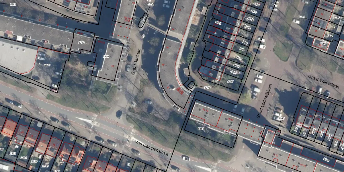 Het perceel waarop Graaf Janlaan 96 staat heeft een oppervlakte van 2690 m². Dit is een zeer groot perceel. De perceeloppervlakte wordt geregistreerd door het Kadaster. Gedetailleerde informatie over de maten van dit perceel kunt u vinden in het rapport Kadastrale kaart met maatvoering van Graaf Janlaan 96.