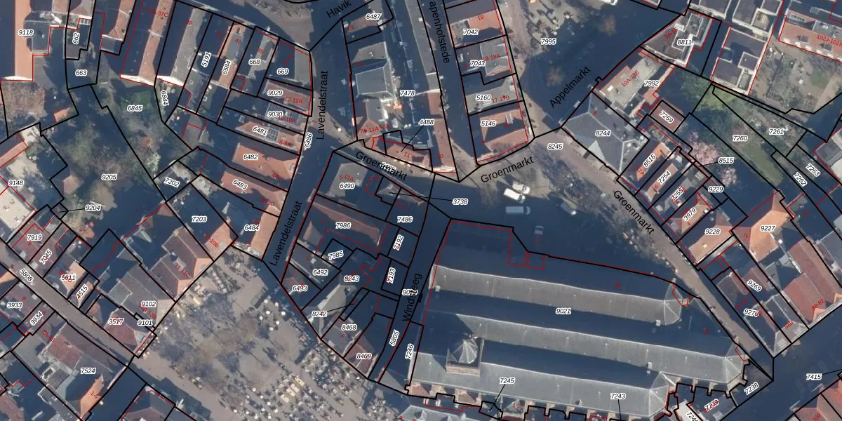 Het perceel waarop Groenmarkt 13 staat heeft een oppervlakte van 70 m². Dit is een klein perceel. De perceeloppervlakte wordt geregistreerd door het Kadaster. Gedetailleerde informatie over de maten van dit perceel kunt u vinden in het rapport Kadastrale kaart met maatvoering van Groenmarkt 13.