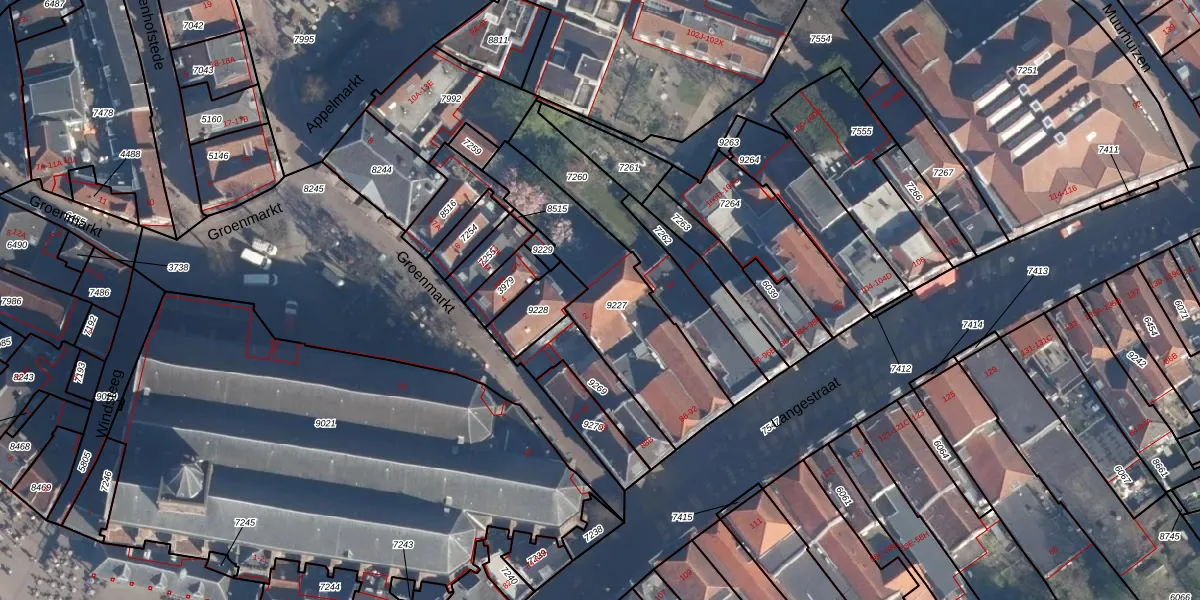 Het perceel waarop Groenmarkt 2-A staat heeft een oppervlakte van 604 m². Dit is een groot perceel. De perceeloppervlakte wordt geregistreerd door het Kadaster. Gedetailleerde informatie over de maten van dit perceel kunt u vinden in het rapport Kadastrale kaart met maatvoering van Groenmarkt 2-A.