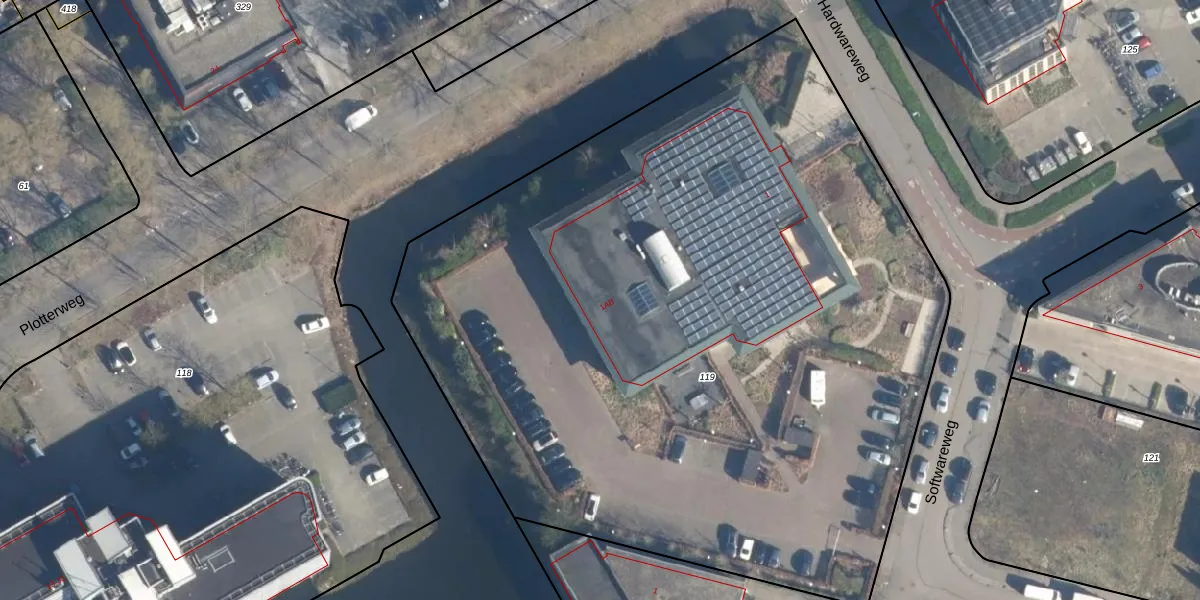 Het perceel waarop Hardwareweg 1-B staat heeft een oppervlakte van 5755 m². Dit is een zeer groot perceel. De perceeloppervlakte wordt geregistreerd door het Kadaster. Gedetailleerde informatie over de maten van dit perceel kunt u vinden in het rapport Kadastrale kaart met maatvoering van Hardwareweg 1-B.