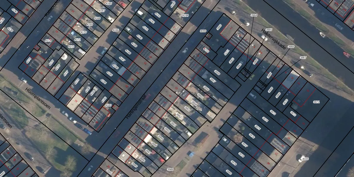 Harlingenstraat 13 is gelegen op kadastraal perceel HLD02B3954. Deze kadastrale aanduiding is uniek en wordt gebruikt door het Kadaster om eigendomsrechten en andere zakelijke rechten vast te leggen. Het perceel maakt onderdeel uit van de kadastrale gemeente Hoogland.