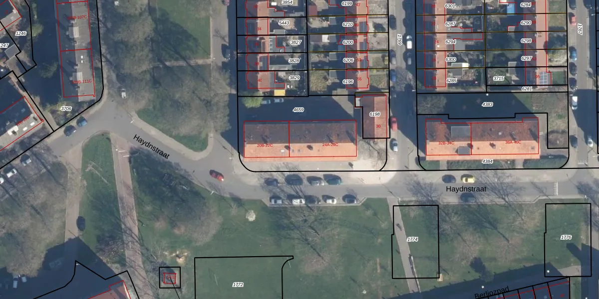 Het perceel waarop Haydnstraat 24-B staat heeft een oppervlakte van 1115 m². Dit is een zeer groot perceel. De perceeloppervlakte wordt geregistreerd door het Kadaster. Gedetailleerde informatie over de maten van dit perceel kunt u vinden in het rapport Kadastrale kaart met maatvoering van Haydnstraat 24-B.